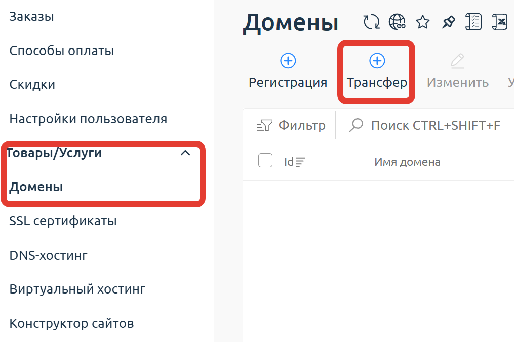 В разделе "Товары/Услуги" -> "Домены" нажмите на кнопку "Трансфер" и следуйте по шагам. Корректно заполните все необходимые поля и укажите код трансфера домена. Перенос осуществляется бесплатно.