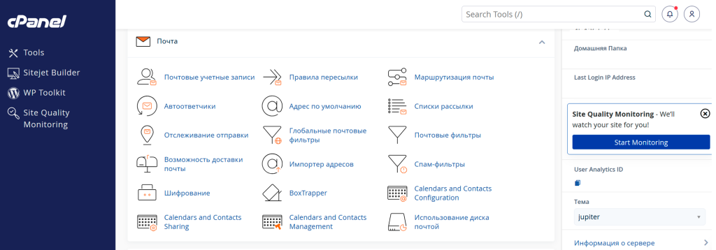 Интуитивно понятная и простая в использовании, cPanel позволяет вам управлять аккаунтом (учётной записью) хостинга с максимальной эффективностью. Будь то создание новых пользователей FTP и email-адресов или ресурсов мониторинга, создание субдоменов или установка программного обеспечения.